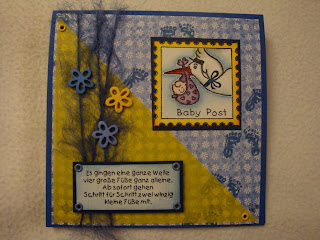 Deine Baby-Karte ist ganz toll geworden. Auch mir gefällt sehr gut wie du das Garn mit den Blümchen als Dekoration verwendet hast.Liebe Grüsse vonKarina
